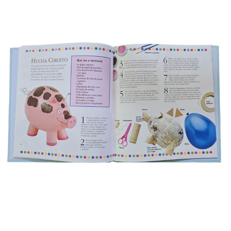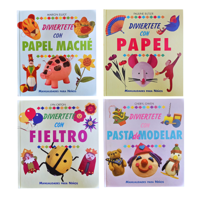 Esta entretenida colección de 4 tomos de manualidades para niños te enseñara como confeccionar diseños de papel mache, en fieltro, diseños de papel y diseños de pasta de modelar, cada proyecto está claramente explicado paso a paso.