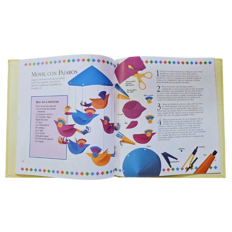CONTENIDO: Introducción. Flores de papel. Tarjeta con payaso. Guirnalda de flores. Careta de ratón. Cestos de mimbre. Móvil con pájaros. Abanicos. Minimarionetas. Separador de página. Libro encuadernado a mano. Plantillas.